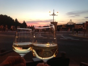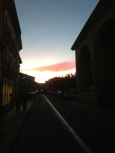 The tour eventually wound its way to the western part of the downtown area where a large crowd had gathered to watch the sunset. Kathryn and I jumped off the bus to enjoy the show. The setting was a group of government buildings perched on the edge of a 100-foot bluff which allowed a broad view toward the west. The sunset spectacular lasted about an hour which allowed us to grab a some wine and tapas from a streetside cafe.
