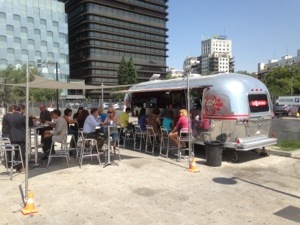 We got back on another tour bus as it was completing its run for the night but soon jumped off again to check out the Plaza Mayor. First thing I learned in Spain: when in doubt, go to the Plaza Mayor. Every village, town and city has one. Before we got to the plaza, however, we saw a cool-looking glass building and found a high-end food court inside. The place was packed with people tasting food and drink from all over Spain and the world – wine, cheese, olives, sushi, chocolates, coffee, tapas, English beers. We tasted some Sangria (first of the trip) and got the secret recipe for our future use.